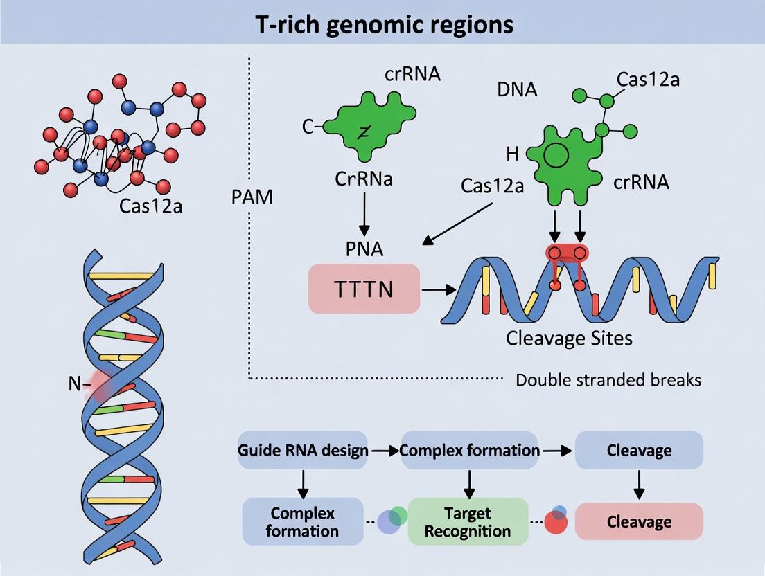 The CRISPR-Cas12a system, recognizing a T-rich Protospacer Adjacent Motif (PAM) sequence (TTTV, where V is A, C, or G), offers a unique advantage for interrogating genomic regions with inherent T-nucleotide bias. This application note details the relevance and protocols for leveraging Cas12a to study and target biologically critical regions—disease-associated loci, gene promoters, and repetitive elements—that are statistically enriched in T/A nucleotides. This work is framed within a broader thesis developing optimized Cas12a protocols for functional genomics and therapeutic targeting in these regions.