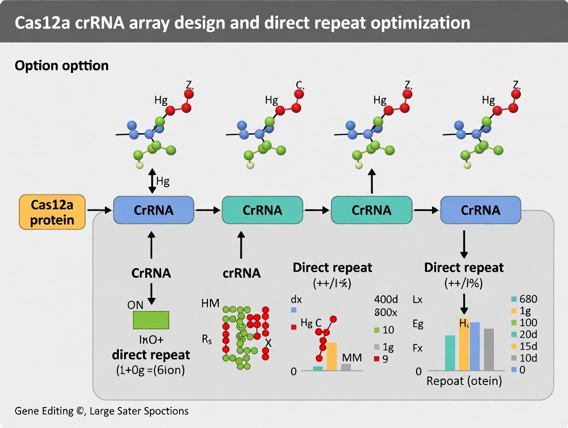 Mastering Cas12a crRNA array design and direct repeat optimization unlocks the full potential of this versatile CRISPR system for complex biological applications. The foundational understanding of its unique RNA-guided endonuclease mechanism informs the methodological design of efficient, multi-target arrays. Proactive troubleshooting and systematic optimization of repeat sequences and array architecture are critical for overcoming efficiency bottlenecks. Rigorous validation confirms that well-designed Cas12a arrays offer distinct advantages over Cas9 for multiplexed editing, particularly due to their simpler RNA components and precise staggered cuts. Looking forward, continued engineering of direct repeats and array formats will expand Cas12a's utility in synthetic biology, combinatorial genetic screening, and next-generation molecular diagnostics, solidifying its role as an indispensable tool for biomedical research and therapeutic development.