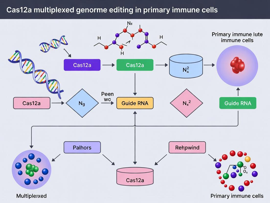 Cas12a multiplexed genome editing represents a paradigm shift for engineering primary immune cells, offering a streamlined, efficient, and potentially less toxic alternative to Cas9 for complex multi-gene modifications. By leveraging its inherent advantages—such as simplified multiplexing via a single crRNA transcript and distinct DNA cleavage profile—researchers can overcome historical bottlenecks in immune cell therapy development and functional discovery. Success hinges on a meticulous, optimized workflow tailored to the fragility of primary cells. While challenges in delivery and viability persist, the validated performance of Cas12a, especially for generating polyclonal knockouts, positions it as a cornerstone technology for the next wave of off-the-shelf CAR therapies, in vivo cell engineering, and sophisticated immunological screens. Future directions will focus on improving delivery vehicles, combining Cas12a with precise editors like prime editors, and translating these robust ex vivo protocols into safe, effective in vivo genomic medicines.
